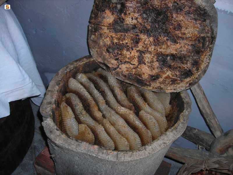 The traditional beehive, used for centuries, is made from cork and is still used in the interior although more modern hives now predominate. The cork is cut and formed into a cylinder. This sits on the ground and is covered with a wooden (often cork) top held on with stones, the bees entered from a hole at the bottom. Harvesting the honey is accomplished by smoking out the bees, and moving them to an empty hive, then removing all the honey from the original hive (see video)… a process that often lost the bees. The honey is squeezed out by hand, the remaining compressed wax combs, still containing pollen and honey, are rinsed in warm water. This water is then boiled and reduced into “Saba Honey” or Saba di miele, a kind of thick jammy syrup eaten on bread, used as a cooking ingredient, or as a filling for cakes.