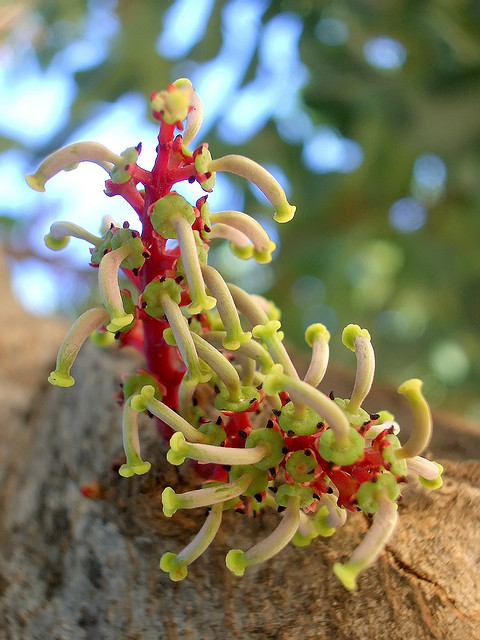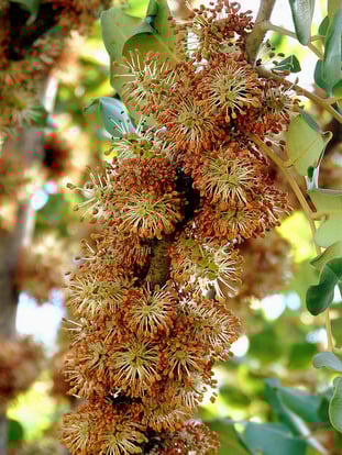 The carob tree comes in separate male and female trees. Flowers of the male are stamen clusters with pollen, producing a very strong odor, while the female produces small, yellow, aromatic flowers (pistals), grouped in clusters. Both male and female flowers produce nectar and attract large numbers of insects. As they are unable to self-pollinate, this is a task left to insects, bees and the wind.