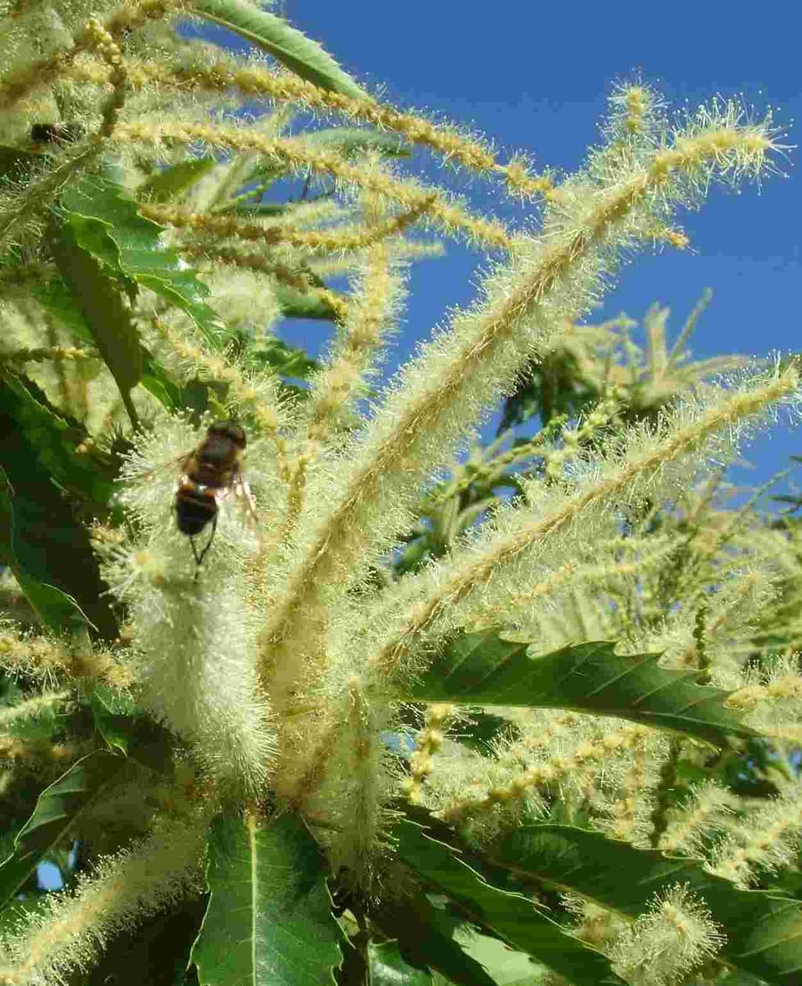 The chestnut tree belongs to the same family as beeches and oaks. For thousands of years the chestnut was a primary source of nutrition in the mountainous areas of the Mediterranean where grains did not grow well. The primary honey producer, the sweet chestnut tree (Castanea sativa) is common in Europe where it was introduced from Sardis (in what is now Turkey) thousands of years ago, hence the name Sardinian Nut, now known simply as the chestnut…not to be confused with Sardinian honey, so called because it is produced on the Italian island of Sardinia.