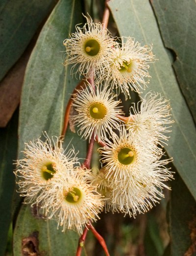 The Yellow Box Eucalyptus has creamy pale yellow blossoms and a yellow inner bark. The Latin name, Eucalyptus Melliodora is apt; Melliodora is translated as “odor of honey” referring to the sweet honey aroma of the blossoms. The Yellow Box is a common species in the grassy woodlands of the tablelands and western slopes of the Great Dividing Range, extending from northern Victoria, through New South Wales into southeastern Queensland. This species is usually 15–30 m tall and mainly grows on gentle slopes, foothills or on flats near watercourses. It blossoms from October through January.