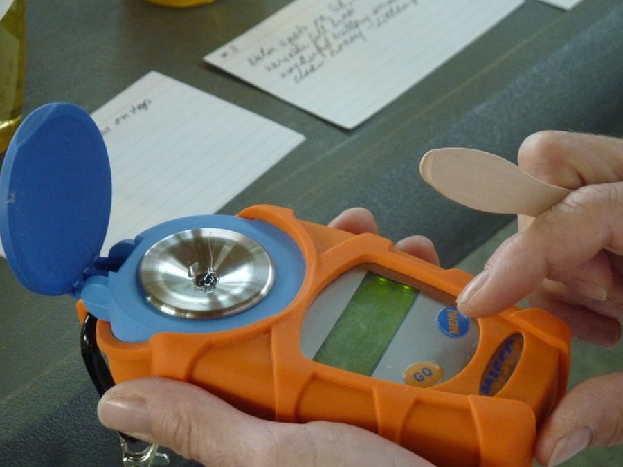 Checking the moisture content of the honey with a refractometer. 15.1 to 17.5% is the target. Over 18.6% is a fail.