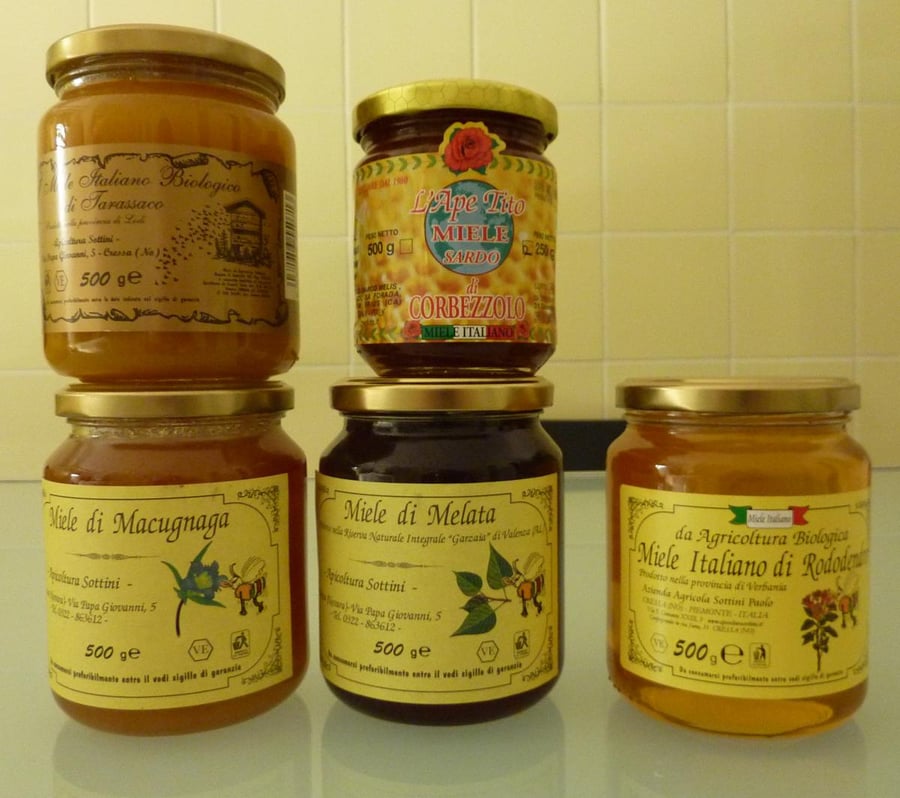 I bought these, and after much discussion, Dandelion (Tarassaco), Macugnaga honey and Honey Dew/ Forest Honey (Melata). All apparently, except for the Macugnaga, single flower honeys, certified authentic and some organic. The dandelion is one of my favorites because of its character and challenging flavor, the strawberry tree honey is uniquely delicious, with an mild sweetness and surprising bitter aftertaste.